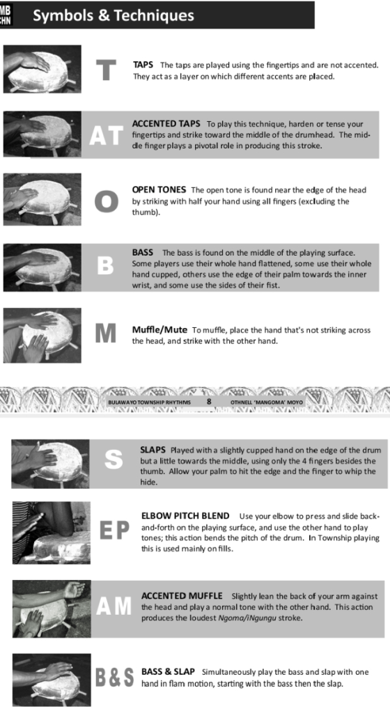 Most of the 4/4 or 2/4 Township Rhythms are played using the hand-to-hand sticking (RL RL RL RL or LR LR LR LR). The primary strokes are Tap Strokes and the accents can vary from Tone, Bass, Muffle, Accented Muffle, Slaps etc., and the stroke that is native to Zimbabwe, which is an Accented Tap. The nonaccented taps are usually a demarcation of the beat by 4.
